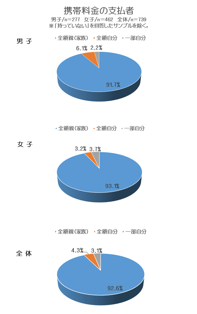 携帯料金の支払者は「全額親(家族)」が全体の約93%で最も多く、「全額自分」は、約4%に留まった。