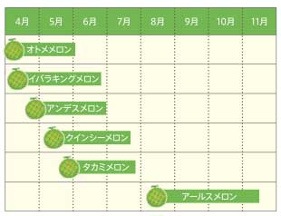 メロンというと、表面に網目がある「ネットメロン」の印象が強く、高級品というイメージがある人も多いのではないでしょうか。しかし、最近では品種改良や栽培技術の進歩により、以前はガラス温室で栽培されたネットメロンもビニールハウスの一種、パイプハウスでの栽培が可能になるなど、リーズナブルな価格で手に入るようになりました。茨城県で栽培されているメロンの多くもこのネットメロン。豊富な種類のネットメロンが栽培されており、出荷時期は4月から11月と、長い期間旬のメロンを味わうことができます。