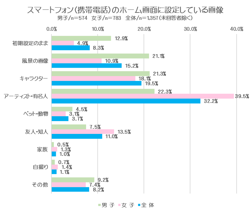 最も多かったのは、「アーティスト・有名人」の約32%。次いで「キャラクター」が約19%、「風景の画像」が約15%と、自分で撮影したもの以外を設定する様子も多く見受けられた。