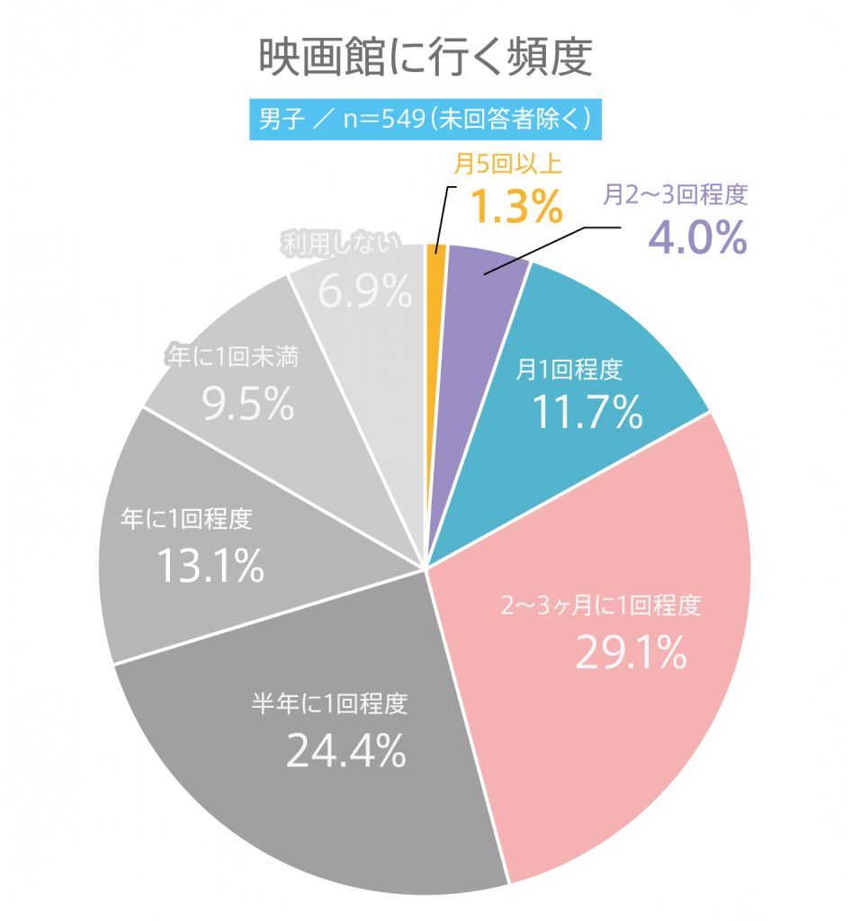 映画館に行く頻度について、男女ともに「2~3ヶ月に1回程度」と回答した高校生が一番多く、男子は約29%、女子は約34%。