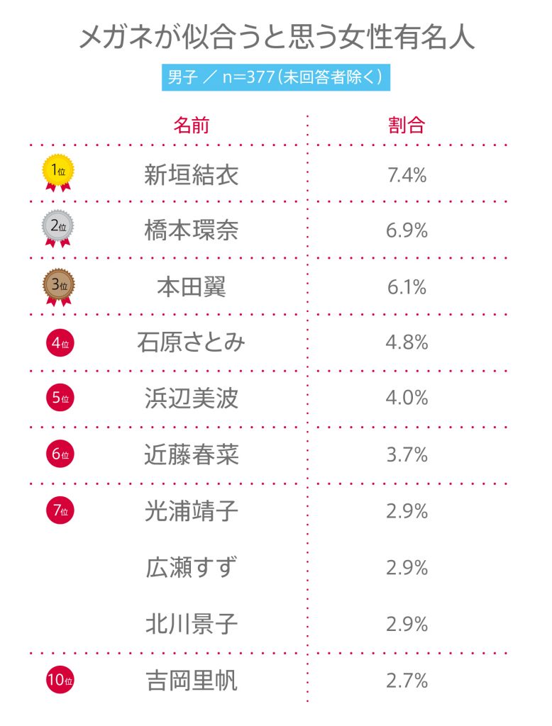 2位には男子が橋本環奈、女子は北川景子、3位には男子が本田翼、女子は綾瀬はるかがランクイン。