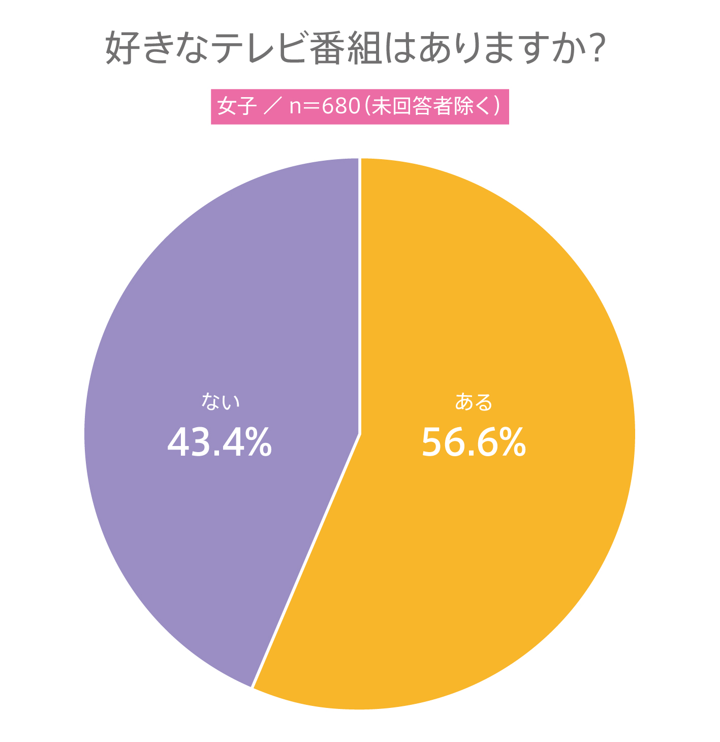 以前紹介した「高校生意識調査(https://www.ytjp.jp/2021/09/29/1000ninanketo-tv1)」では、高校生のテレビ視聴時間が減少傾向にあることがわかりました。では、そんなテレビを観る機会が少なくなっている高校生には、好きなテレビ番組はあるのでしょうか?YTJPでは、「好きなテレビ番組」の有無についてアンケート調査を実施。結果は、男女ともに約57%が好きなテレビ番組が「ある」という結果に。3年前に行った同調査(https://www.ytjp.jp/2018/02/23/1000ninanketo-tvnikansuruishikichousa )では、好きなテレビ番組が「ある」と回答したのは、男子が約70%、女子が約80%でした。3年前と比較すると減少している結果となりました。