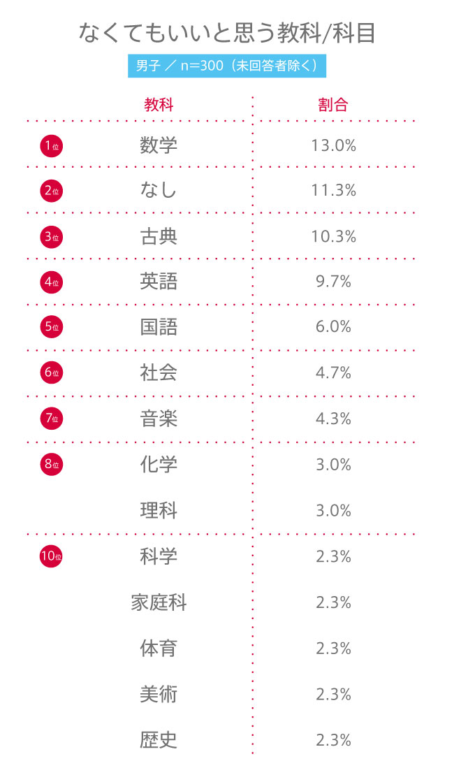 男子の2位は“なし”。「必要ない教科はない」という高校生も多数!女子でも7位にランクインし、17票を獲得しました。