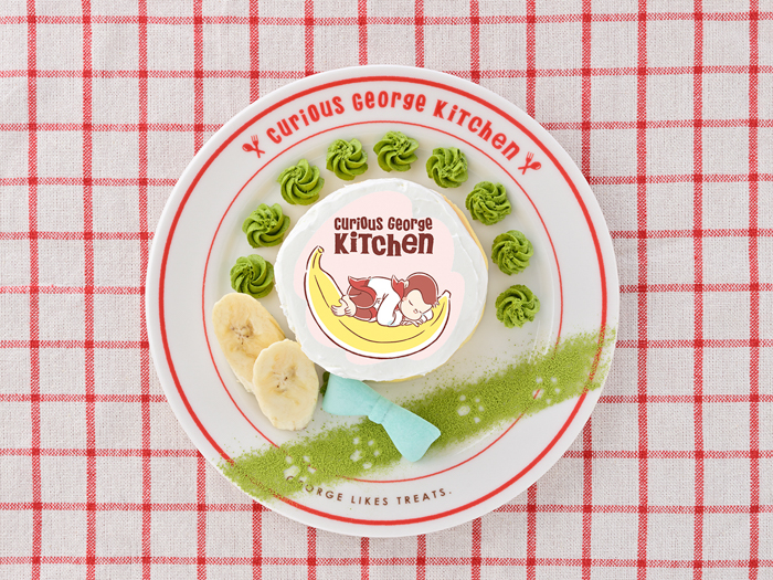「『ニョッキ』もおてつだい?選べるアートのしっとりスフレパンケーキ」は、しっとりとしたスフレパンケーキのなかにバナナソースが入っていて、一日頑張ったご褒美やぜいたくに甘さを楽しみたい時にぴったりの夜のデザートです。ケーキにプリントするジョージのアートは4種類から、ホイップクリームの色と味は5種類から選べるので、自分だけの特別なオリジナルデザートをお楽しみいただけます。