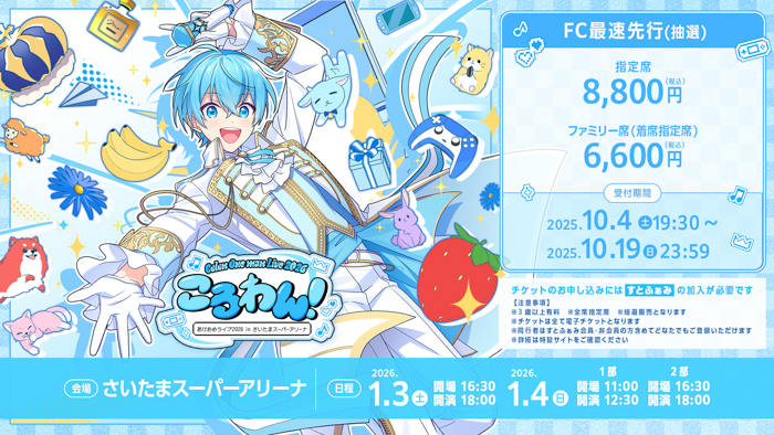 2025年1月に同会場で開催された「すとぷり」ワンマンライブ『すとろべりーめもりーVol.Forever!! 『すとぷり Best Album Release Party 2025』では、自身のソロワンマンライブ開催決定が発表された際に、「たまアリでやりたい!お願いしますっ!」と懇願し、満面の笑みを浮かべていた「ころん」。その時に口にした夢のステージが、ついに現実となります。ライブ開催に先がけ、すとぷり公式ファンクラブにて最速先行(抽選)チケット受付を2025年10月4日(土)19:30より開始した。