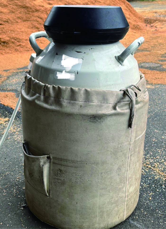 牛に受精する際に種を保存しておくボンベ。中には液体窒素が入っており、牛の精液が入ったストローが冷凍保存されています。親牛に発情が見られたら、受精の時に使う専用の注入器にストローをセットして、受精させます。