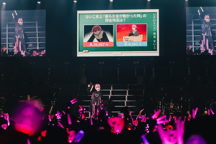 スクリーンに黒板が映し出されムードが一変すると、ないこにまつわる2択クイズが出題される『抜き打ち!ないこ理解度テスト!』へ。「ないこが好きな寿司ネタは?」や「この歌ってみた(「からくりピエロ」)は何作品目?」といったベーシックな問いはもちろん、2枚の写真を見てどちらが5歳のないこかを当てるというマニアックな問題もあって大盛り上がり。なかでも、撮りおろしインタビュー動画内で「目の前に彼女のような大事な存在がいたら、何をしてあげたいですか?」という質問に、ないこがどう返答したかを予想する場面では、ないふぁみとないこによる腹の探り合いが勃発。結果的には、多くのファンがないこの思考を見抜き、「理解度が高いね、びっくりした!」とないこが目を丸くする展開に。全問正解者が出たことで、ご褒美として全員に会場限定オリジナル名刺が配られることとなった。