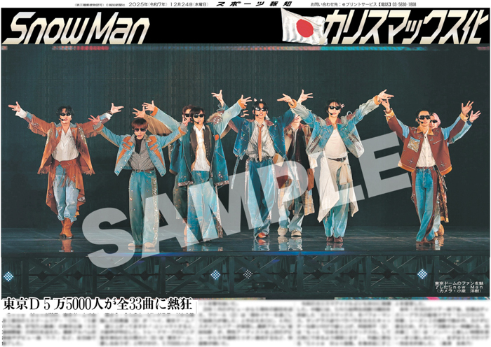 スポーツ報知を発行する報知新聞社は新聞の一部紙面をコンビニエンスストアのマルチコピー機からプリントできる「スポーツ報知コンビニプリント」サービスを展開中。スポーツ紙ならではの大きな写真を使った紙面をプリント版として販売しています。新たに12月24日付掲載、東京ドームで自身2度目の5大ドームツアー「ON」(5都市17公演、計78万人動員)の東京公演(4日連続開催)の初日を迎えたSnow Manの紙面を発売中です。全員バージョン3種類と各ソロバージョン9種類の合計12種類になる。